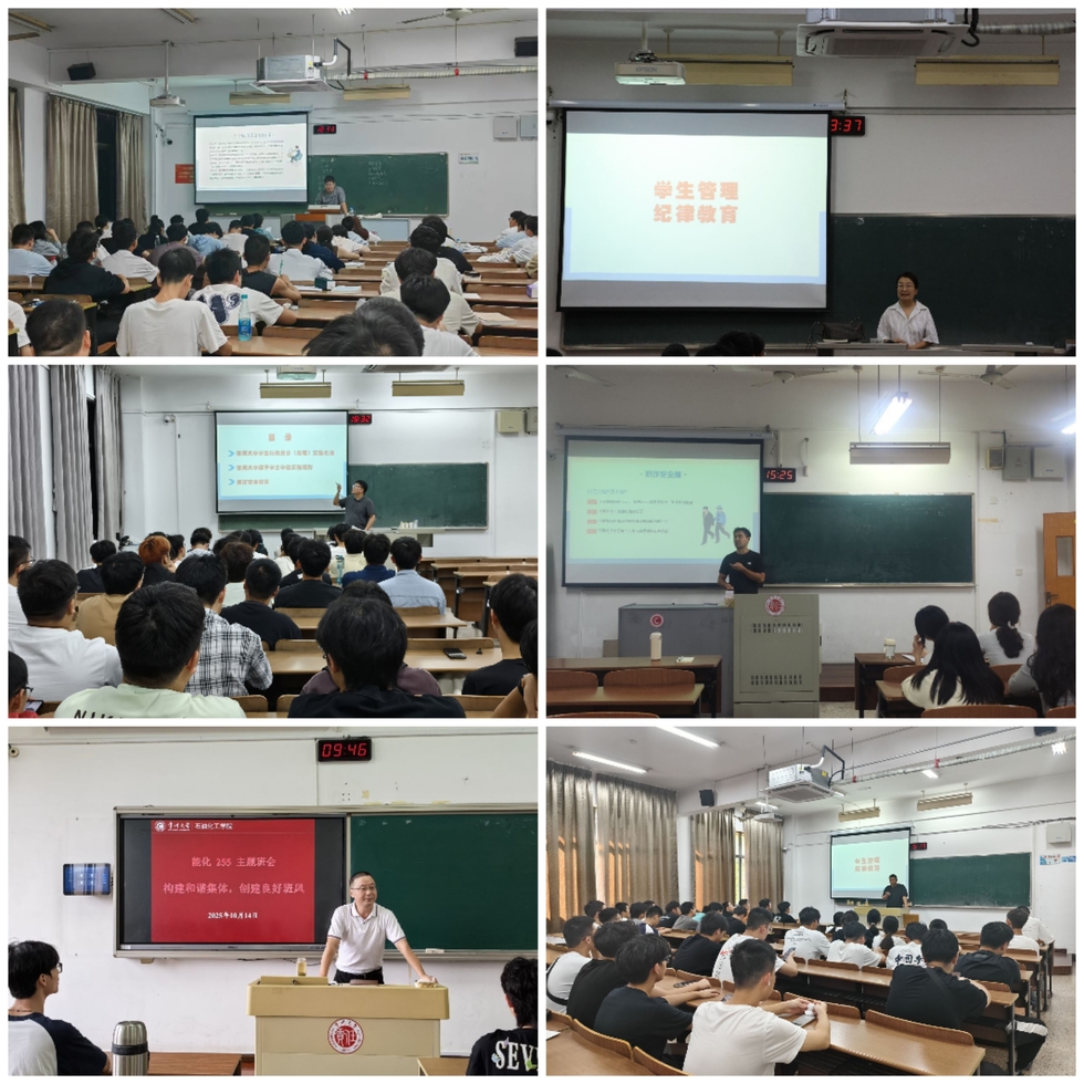 为帮助2025级新生尽快适应大学生活,树立正确的世界观、人生观、价值观,近日,我院精心策划并顺利开展了系列新生入学教育活动。本次教育活动涵盖校史校情、规章制度、专业认知、安全防范等多个模块,通过专题讲座、互动体验等多种形式,为新生们搭建了认知大学、融入集体的“第一堂课”,助力他们在新的人生阶段开好局、起好步。暖心交流,共启新程——班主任见面会为帮助新生快速适应大学学习生活、明确成长发展方向,9月7日,我院各新生班级陆续召开班主任见面会。各班班主任与全体新生齐聚一堂,开启大学阶段师生间的首次深度交流。见面会上,班主任们从个人专业背景、核心教学方向到学术研究经历,结合自身从教经验与往届学生案例,分享时间管理方法、人际交往技巧及学业与生活平衡的实用策略,为新生提供全方位的适应指引。他们鼓励新生既要扎实掌握专业理论知识,筑牢学习根基,也要主动参与学科竞赛、社团实践与科研项目,在实践中锻炼综合能力。启航大学梦,从‘心’认专业——专业思想教育为帮助新生增强专业认知,坚定专业信念,明确发展方向我院于9月17日、9月21日、9月23日分别开展各专业思想教育,各专业负责人石剑、吴大同、文成龙参加。他们结