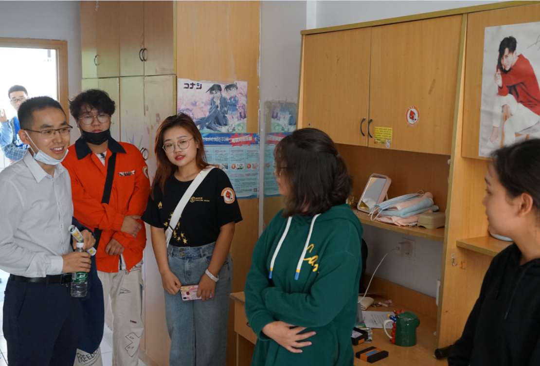 10月11日新生报到当日下午,石油化工学院 食品学院党委书记吴荷平、党委副书记宣慧、副院长刘文杰、副院长黄海、新生班主任和全体辅导员走访了2020级新生宿舍。