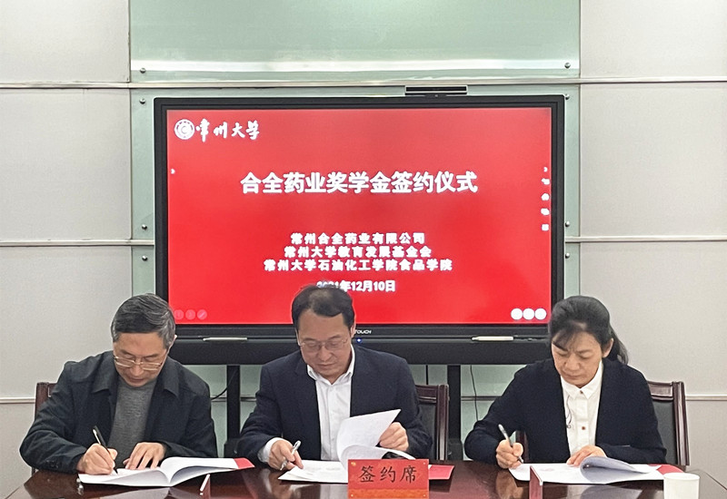 12月10日下午,“合全药业奖学金”签约仪式在文正楼第三会议室顺利举行。常州合全药业有限公司副总裁汪有初、执行主任颜珺、葛永辉、人力资源总监陶俪来校参加签约仪式。常州大学发展规划处专员、教育发展基金会秘书长浦建民、石油化工学院党委书记管春英、院长钟璟、院党委副书记宣慧参加签约仪式。