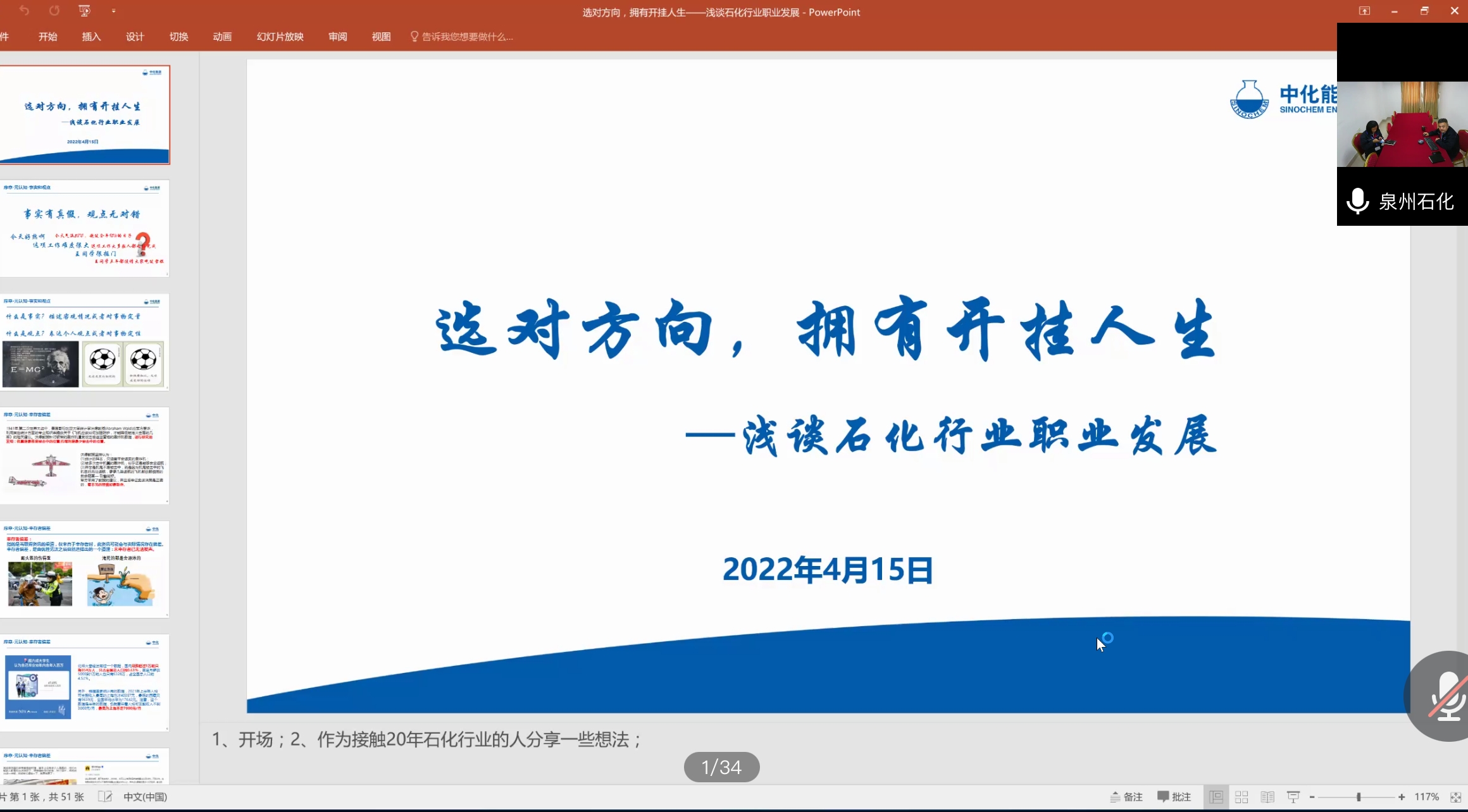 为帮助学生树立职业意识,清晰把脉社会就业形势,提升自身的综合素质,增强就业信心,更好地适应石化行业对人才的需求。4月15日15:00-17:00,常州大学优秀校友,中化泉州石化人力资源副总经理赵剑应石油化工学院邀请为全体大三学生开展主题为《选对方向,拥有开挂人生》的线上就业指导讲座。讲座由学院党委副书记宣慧主持,辅导员徐彬焜和各专业300余名学生参加。