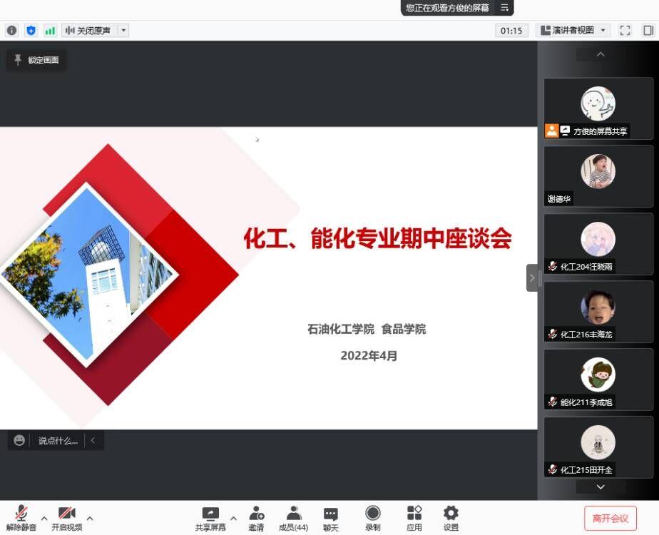 为提高教学质量,加强老师和同学之间的交流,加强学风建设,4月27日下午,我院组织召开了化学工程与工艺专业、能源化学工程专业、应用化学专业、食品质量与安全专业、资源循环科学与工程专业期中教学座谈会,此次会议形式为线上网络会议。院党委书记管春英、副院长刘文杰、专业老师、各专业辅导员及学生代表参加了此次座谈。