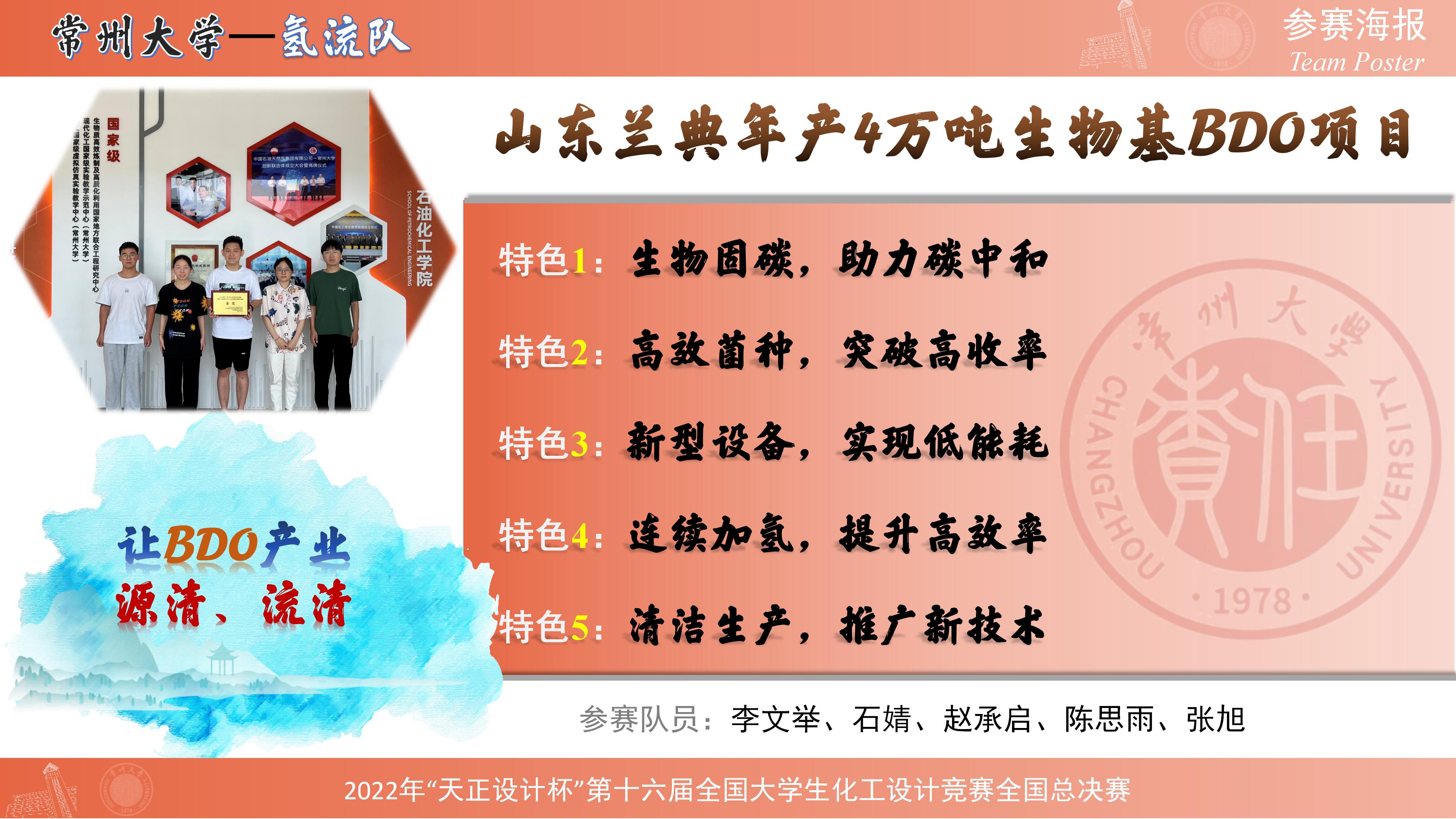 近年来,在我国新材料产业发展规划以及国家“禁塑令”的要求下,可生物降解材料产业发展迅猛。1,4-丁二醇作为可生物降解材料的关键原料,迎来全面爆发的市场需求。我国虽然是1,4-丁二醇产能大国,但还缺乏拥有自主知识产权的核心技术。创新驱动是实现中国绿色可持续发展的必然途径。我校氢流团队作品“山东兰典生物科技股份有限公司年产4万吨生物基1,4-丁二醇项目”以实际工厂原料为基础,着眼于国内生物化工新路线亟待技术突破的实际问题,勇于创新、敢于突破,成为总决赛唯一一支高质量完成从葡萄糖到生物基1,4-丁二醇路线的队伍,从一个全新的角度诠释了可降解塑料课题的最新发展趋势,给竞赛评委专家组留下了深刻印象。