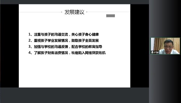 最后,刘茂灿书记向新生家长们提出了几点发展建议:一、需要注重与孩子的沟通交流,关心孩子身心健康;二、重视孩子学业发展情况,鼓励孩子全面发展;三、加强与学校的沟通反馈,配合学校的教育指导;四、了解孩子财务消费情况,杜绝陷入网络贷款危机。