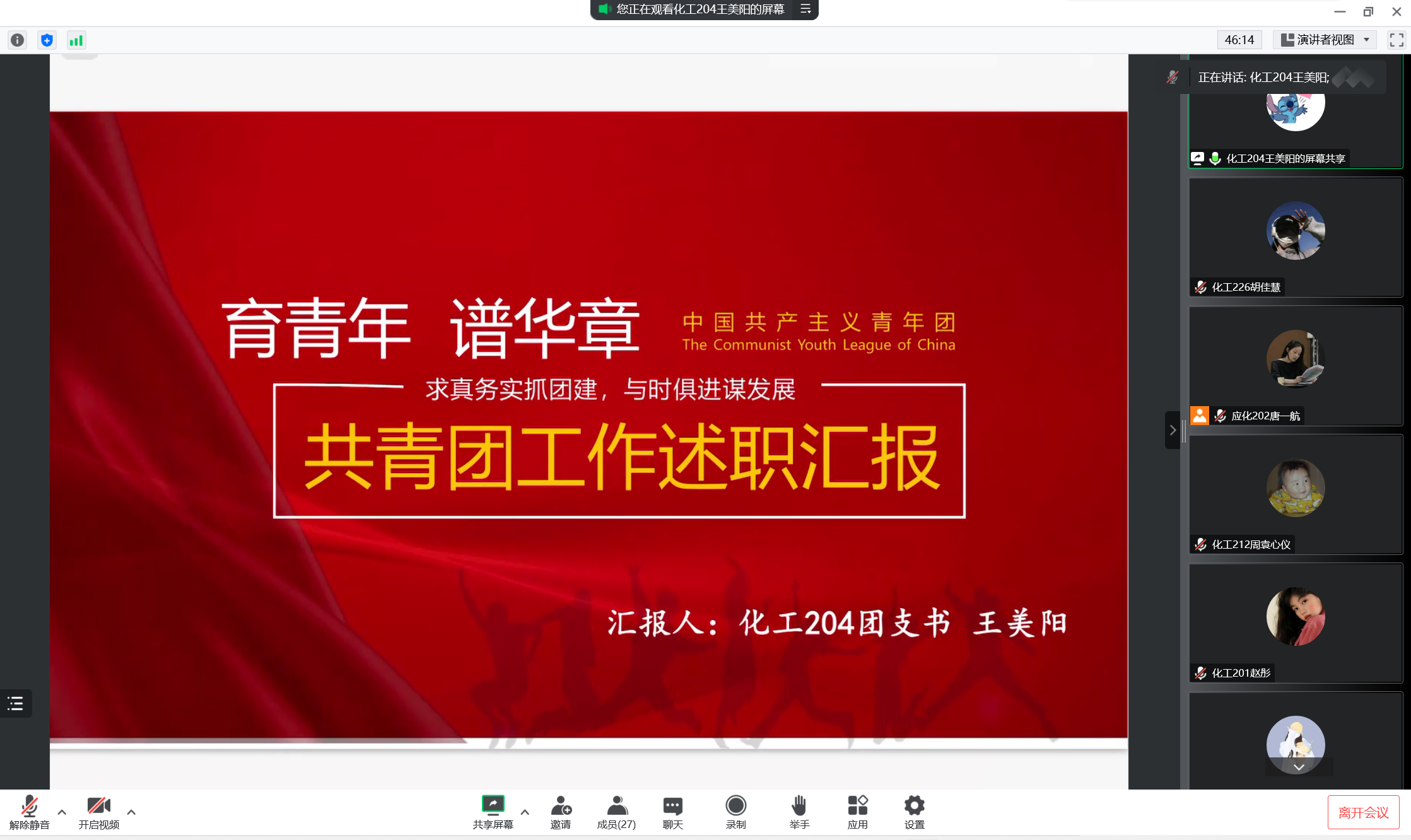 各团支部书记从班团基本状况、团务活动开展及未来组织建设等方面进行汇报,对本年度的工作进行总结,明确了下一阶段工作目标和工作重心。