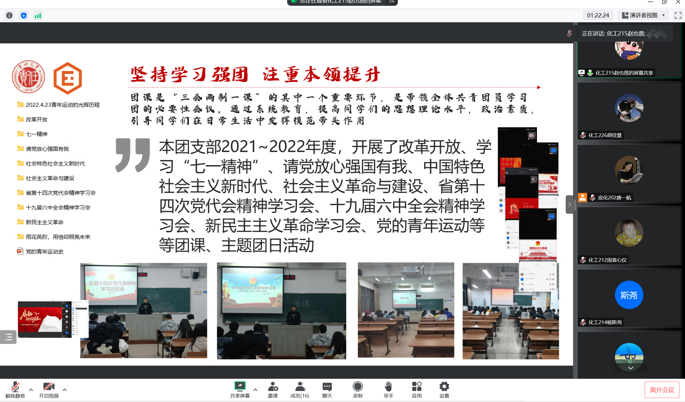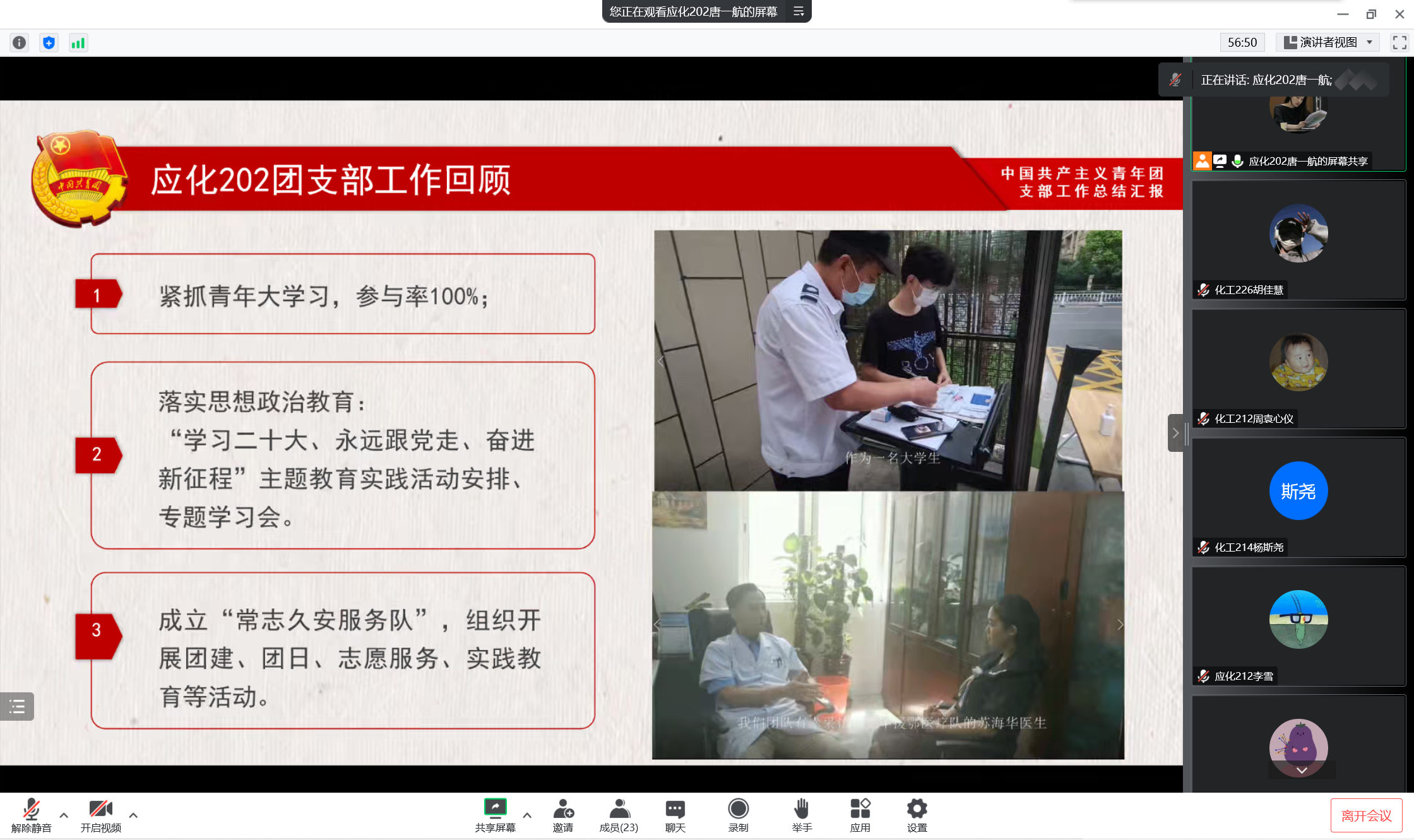 为加强基层团组织建设,完善组织管理,提升团支部的引领力、组织力和服务力,我院于2022年12月9日18:30以线上会议形式召开2022年度团支部年终述职大会。由团委副书记唐一航、团委学生会组织部部长周袁心仪主持会议,19级至21级团支部书记参会述职,本科生辅导员张亚东、唐弋钦、刘爽、何瑞玉聆听指导。