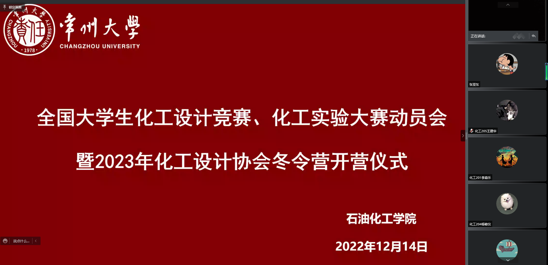 为进一步培养学生的工程设计能力、提高化工专业大学生理论知识水平和实际操作的能力,筹备第十七届全国大学生化工设计大赛和第六届全国大学生实验大赛,我院于12月14日开展全国大学生化工设计竞赛,化工实验大赛动员会暨2023年化工设计协会冬令营开营仪式线上会议。出席本次活动的有校实验室建设与管理处处长马江权、院长助理周满、3D仿真中心黄泽恩老师以及20级化工、能化全体学生,大会由辅导员谢德华主持。