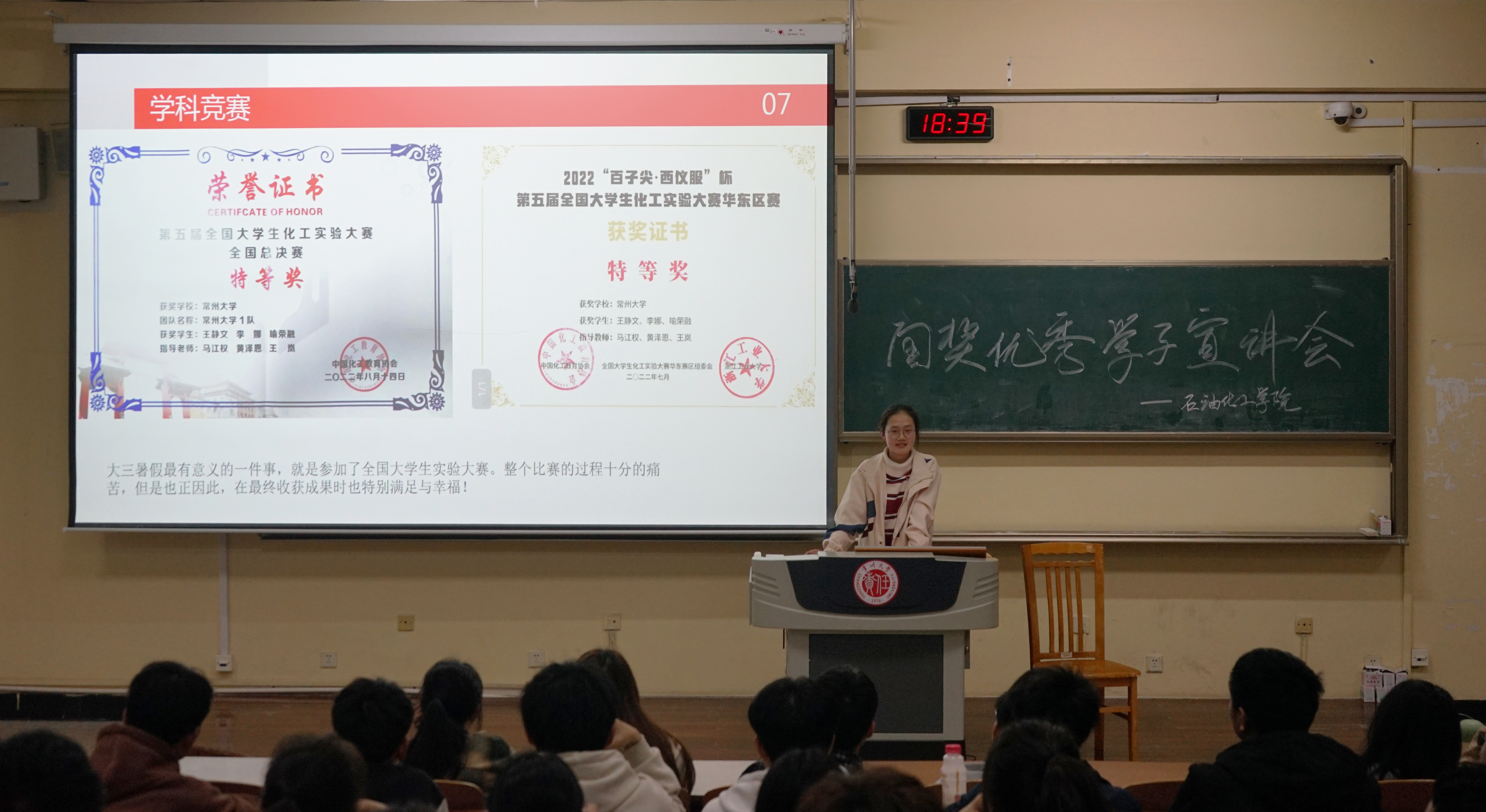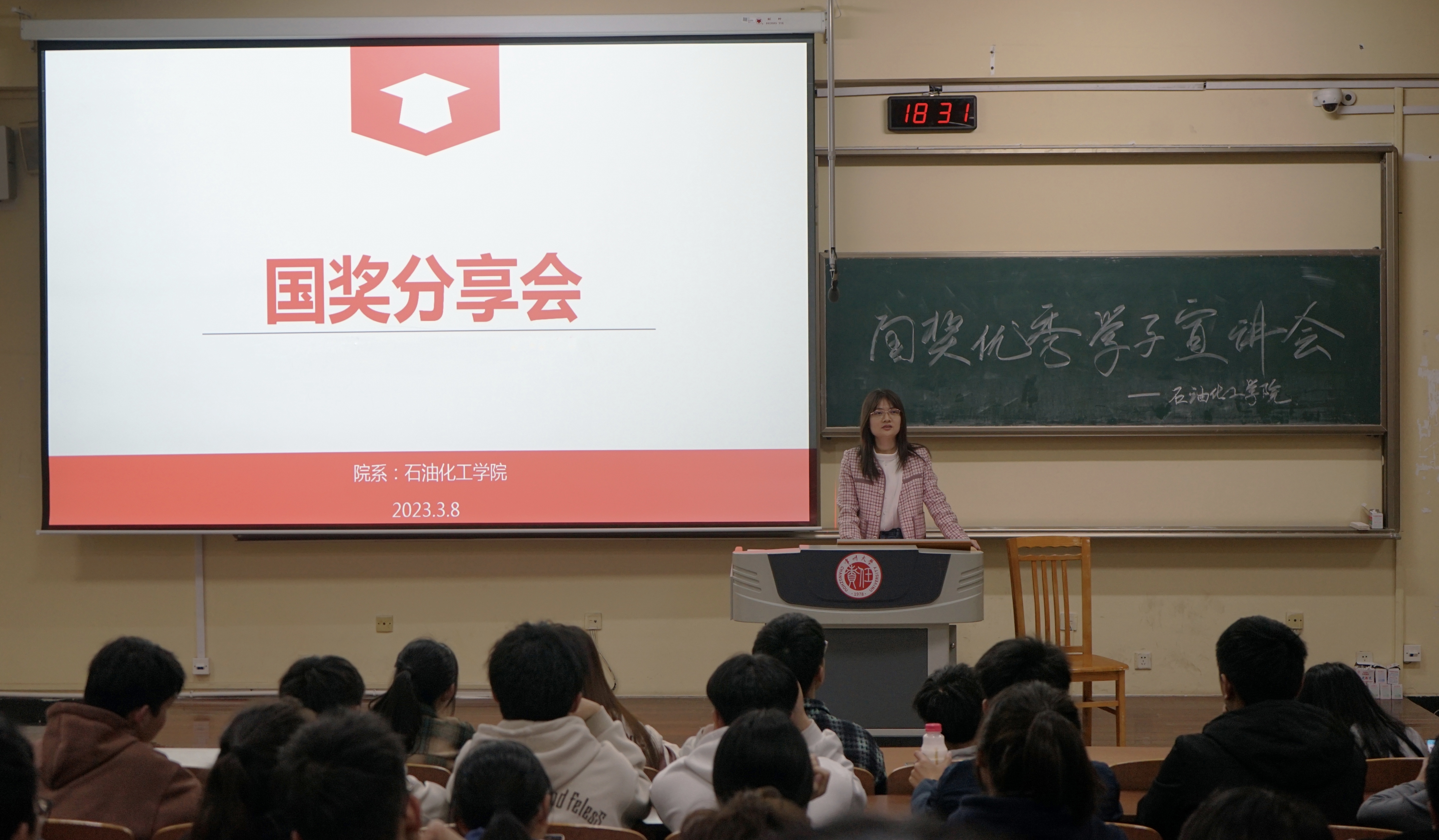 为鼓励我院学生共同进步,走近新时代的青年榜样,2023年3月8日,我院在w3阶举办了国家奖学金优秀学子分享会。辅导员唐弋钦主持,国家奖学金获得者化工193班赵承启、能化191班王静文、应化201班李梦露进行宣讲,全体大一同学参加。