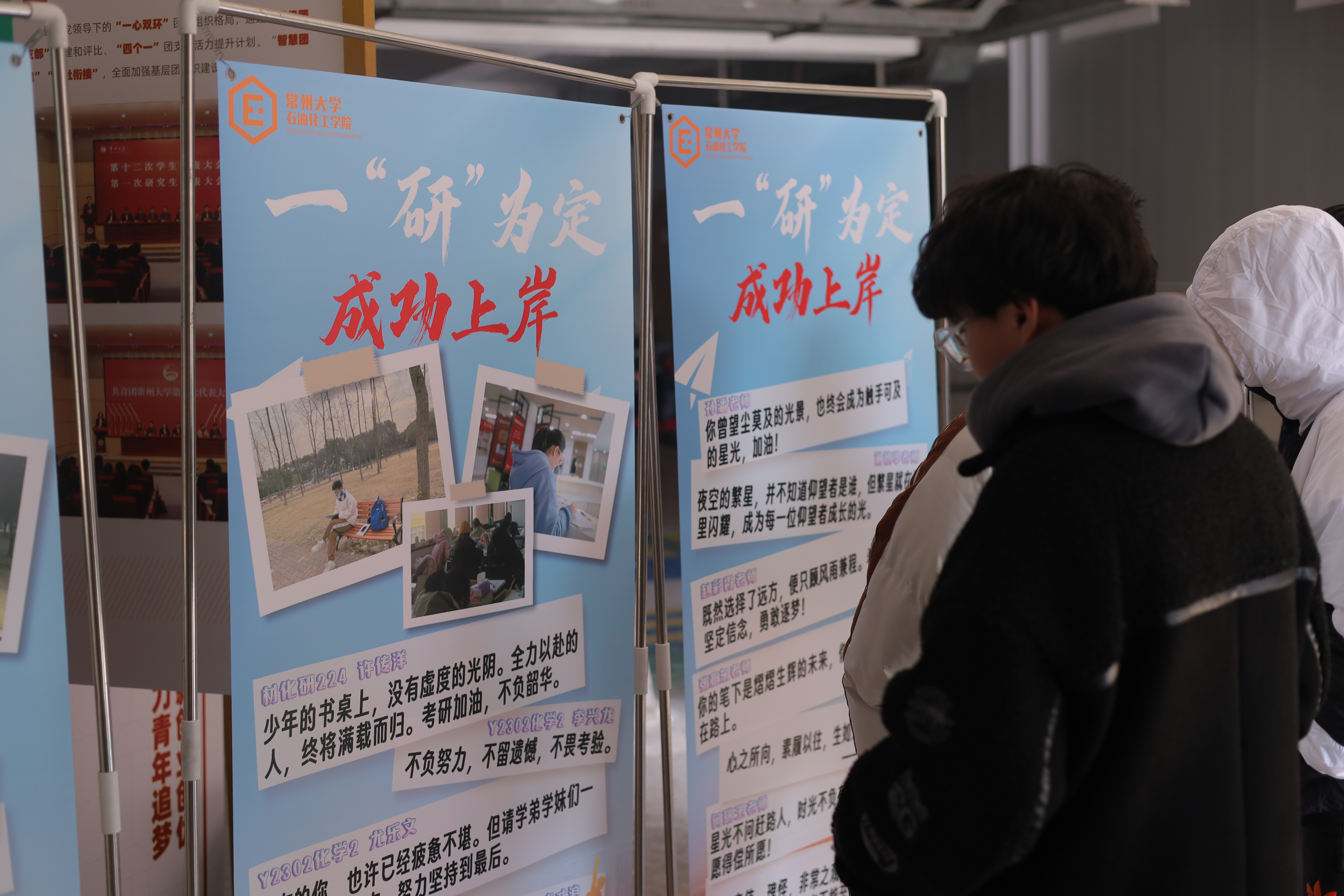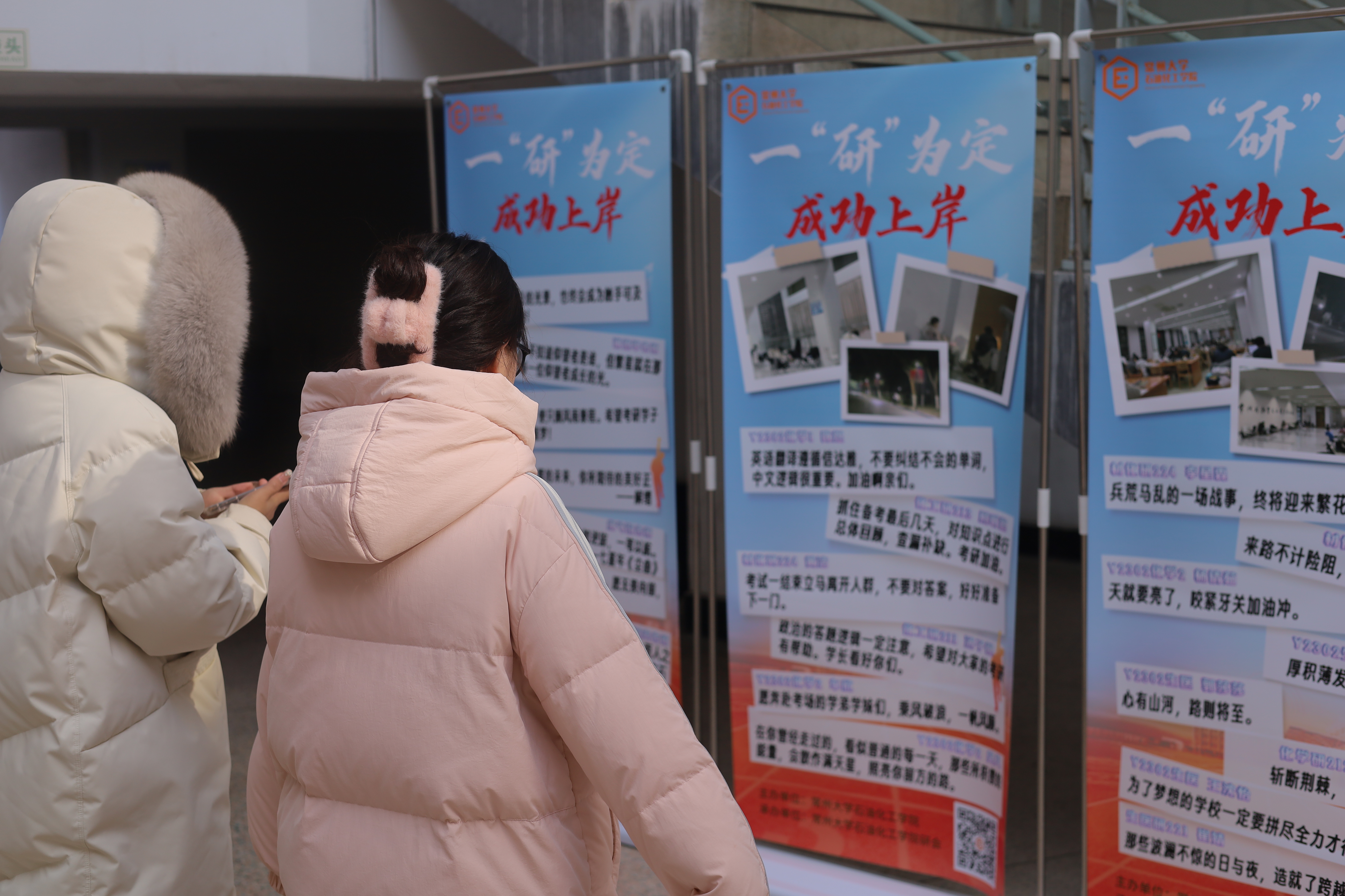 前期,研究生会外联部收集了我院老师和研究生对考研学子真挚的祝福语,并将其制作成海报放置于图书馆、辅楼和主楼一楼。海报一经展出受到众多考研学子的驻足观看,大家纷纷表示老师和学长们的叮嘱非常贴心,祝福非常温暖。