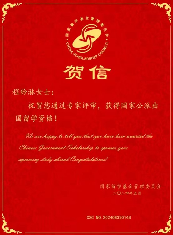 近日,国家留学基金管理委员会(CSC)公布了2024年“国家建设高水平大学公派研究生项目”录取名单。我院2021级化学工程与技术专业硕士研究生程铃淋同学喜获国家公派出国留学资格,将赴日本广岛大学Masakoto Kanezashi教授课题组攻读化学工程博士学位。程铃淋同学主要从事功能膜材料开发及水处理应用方面的研究工作,导师为钟璟教授、郭猛副教授。现已发表SCI一区论文两篇、公开中国发明专利一项、主持并完成“江苏省研究生科研与实践创新计划”项目一项,参与国家重点研发计划子课题和江苏省自然科学基金等项目若干项。