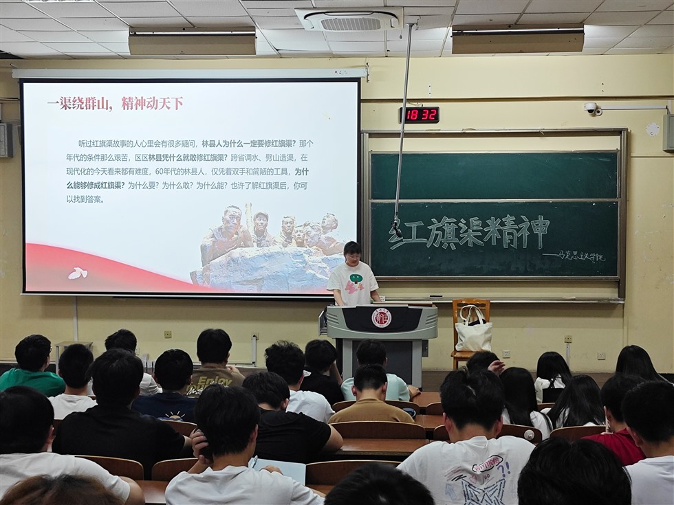 郭瑞琪讲解了红旗渠发展历程并解读以“自力更生、艰苦创业、团结协作、无私奉献”为核心的红旗渠精神。赵也慈结合习近平总书记五四青年节对全国广大青年寄语精神,强调新征途上青年学子应该胸怀理想、勇担重任,学习在科技创新、乡村振兴、绿色发展、社会服务、卫国戍边等各个领域的榜样,以青春之我、奋斗之我为强国建设、民族复兴伟业贡献青春力量。