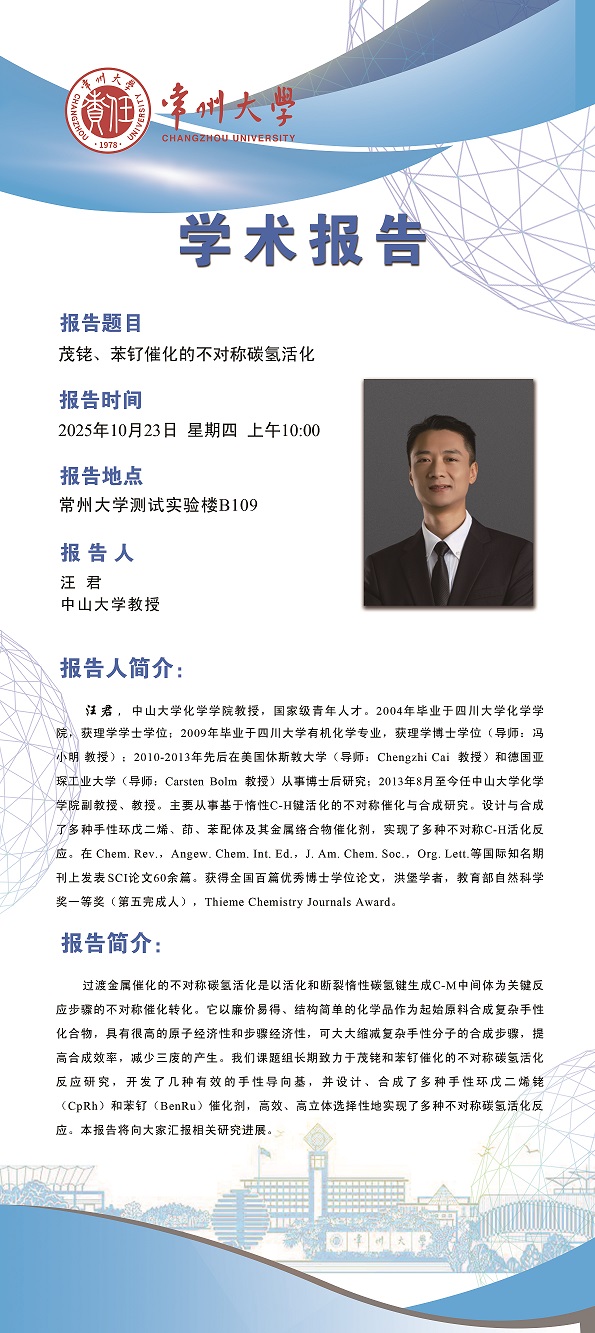 【学术报告】10月23日自然与合成有机化学研究院学术报告——汪君教授 中山大学