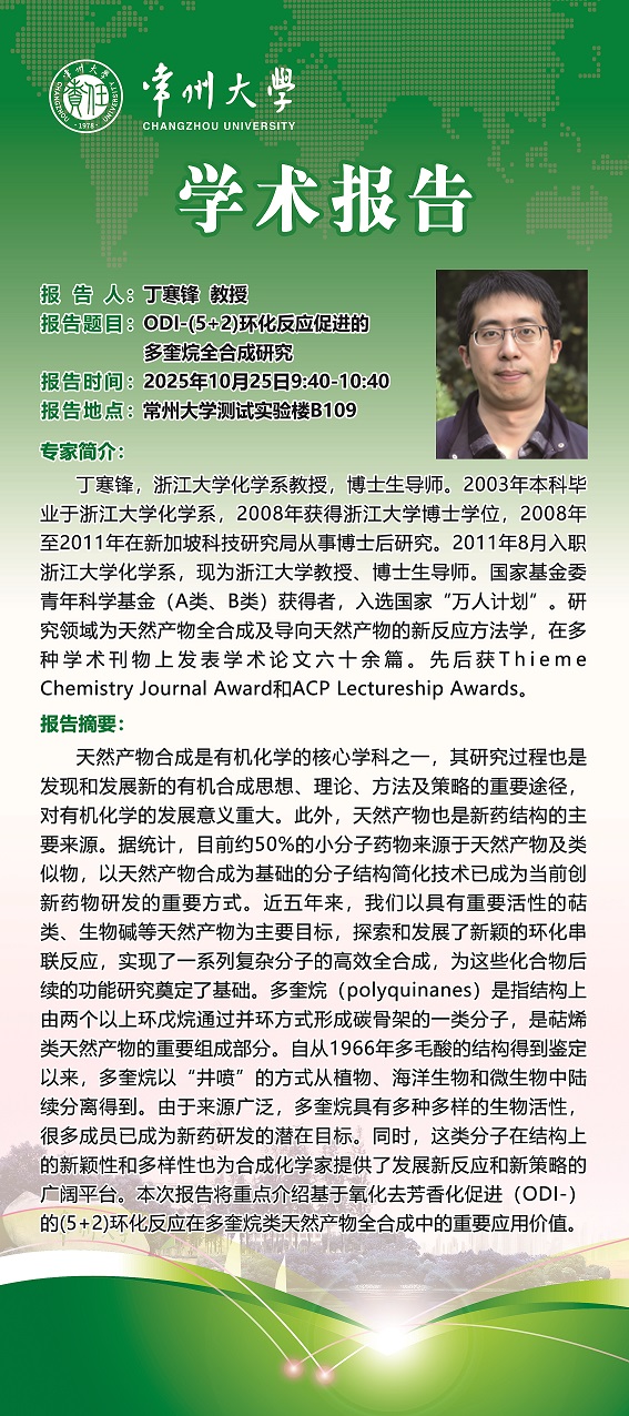 【学术报告】10月25日功能杂环研究院学术报告——丁寒锋教授 浙江大学 顾振华教授 中国科学技术大学