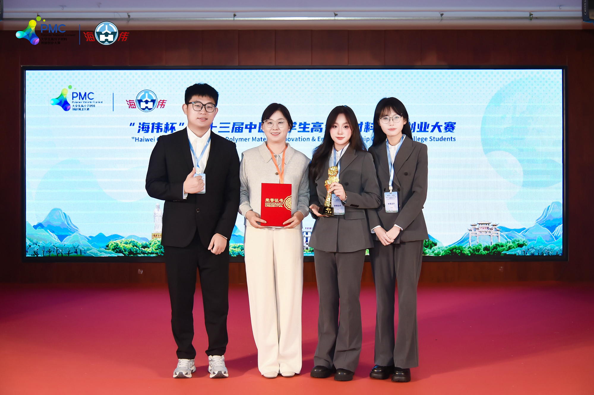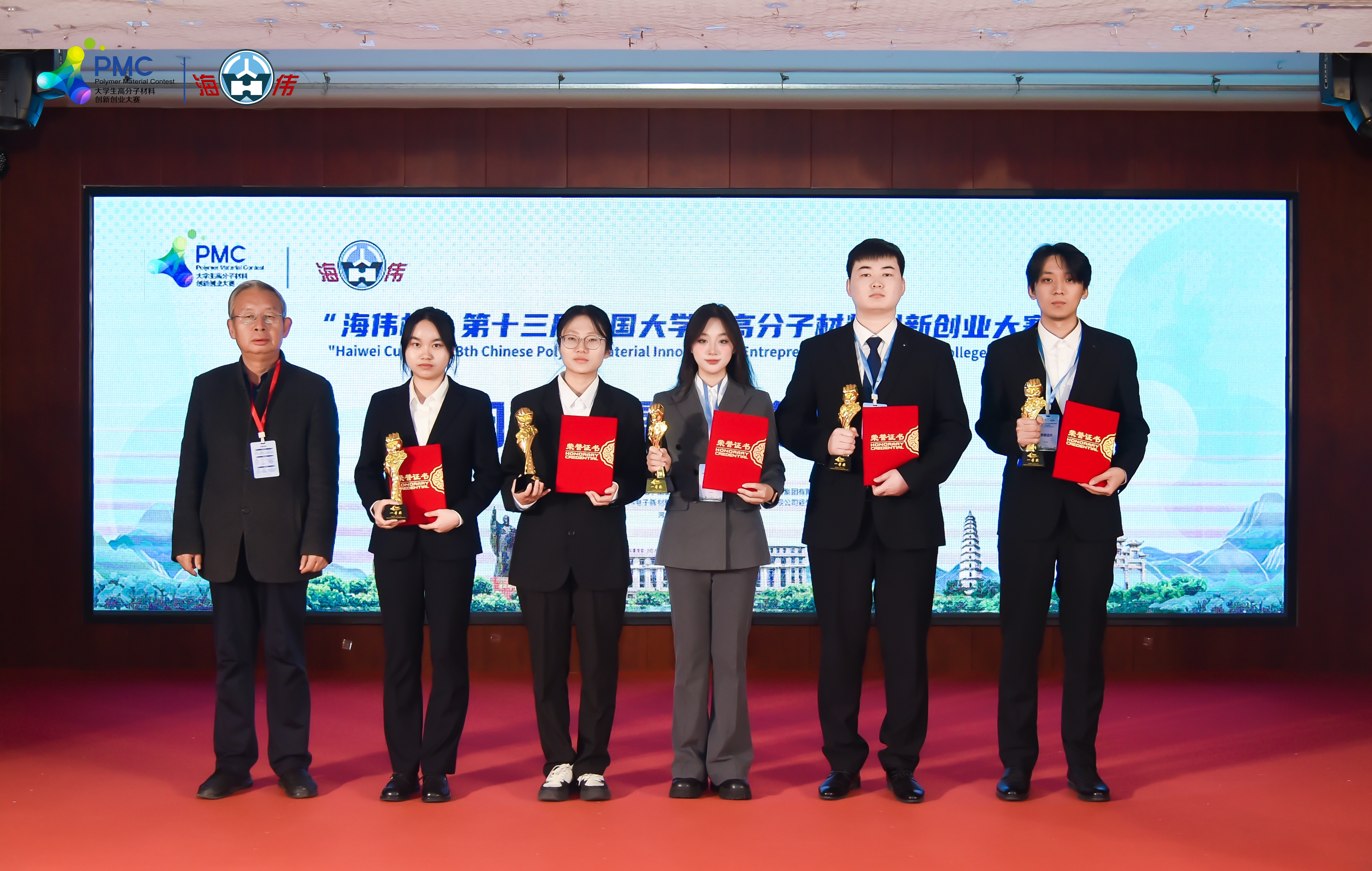 2025 年10 月 17 日至 19 日,由中国石油和化学工业联合会、中国化工教育协会及橡胶谷集团有限公司联合主办,河北海伟电子新材料科技股份有限公司与橡胶谷集团有限公司运营中心联合承办的 “海伟杯” 第十三届中国大学生高分子材料创新创业大赛全国决赛,在河北省衡水市景州县圆满落幕。由我校石油化工学院林理伟、徐松老师指导、石油化工学院和环境科学与工程学院学生唐晨曦、华诗雨、周赛宇、刘兆祖、吴思宇联合申报项目《稀愈先锋——基于超分子包合技术的改性稀土复合材料伤口敷料研发》入围总决赛并在激烈角逐中荣获全国一等奖!