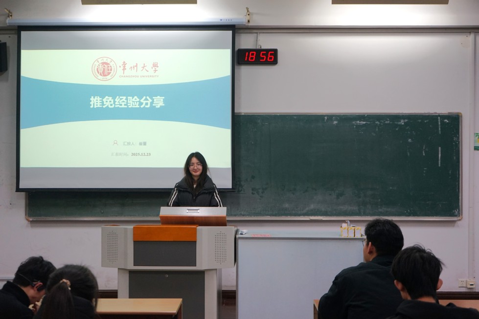 会上,两位同学结合个人经历,围绕推免政策解读、前期准备、院校选择、面试技巧等关键环节展开细致分享。化工225班王舒以“厚积薄发”为主题,指出扎实的专业课是推免基石,并分享了学习方法与科研竞赛对提升能力的关键作用。能化222班崔蕾则聚焦“精准发力”,详解推免流程与材料准备要点,建议及早关注目标院校动态,并结合实例分享了面试中展现优势、从容应答的技巧。