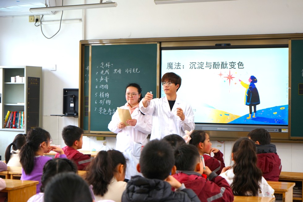 活动现场,志愿者们带领同学们开展两项趣味化学实验,同学们亲手操作实验器材,观察色彩变化与气泡现象,在志愿者的讲解中理解化学原理。随后,志愿者们讲述了长征故事与“常州三杰”革命事迹,让同学们感受先辈的坚韧与赤诚,了解本地革命先辈的奉献事迹。此次活动为我院学子提供了实践锻炼的机会,也为附属小学的同学送去了化学知识与红色滋养。