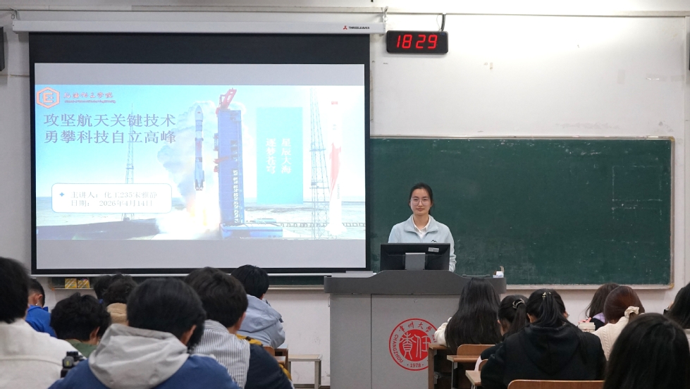 为深入学习航天精神,激励青年学子以科技自立自强为己任,我院于4月14日在W1202教室开展了以“航天强国建设”为主题的“青年讲师团”系列讲座第三讲,该讲座由学生第一党支部党员化工235宋雅静和化工236王思懿两位同学主讲。