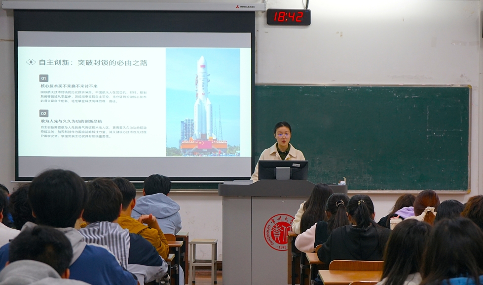 讲座紧扣“攻坚航天关键技术,勇攀科技自立高峰”主题。宋雅静围绕航天强国建设蓝图,系统梳理新时代我国航天事业的辉煌成就,解读迈向航天强国的战略路线,阐明青年在科技自立自强中的实干担当;王思懿则从中国航天的时代跨越切入,详解可重复使用技术等核心领域的攻坚突破,梳理前沿装备的创新成果,传承航天人自力更生、无私奉献的精神内核,号召青年投身强国复兴伟业。