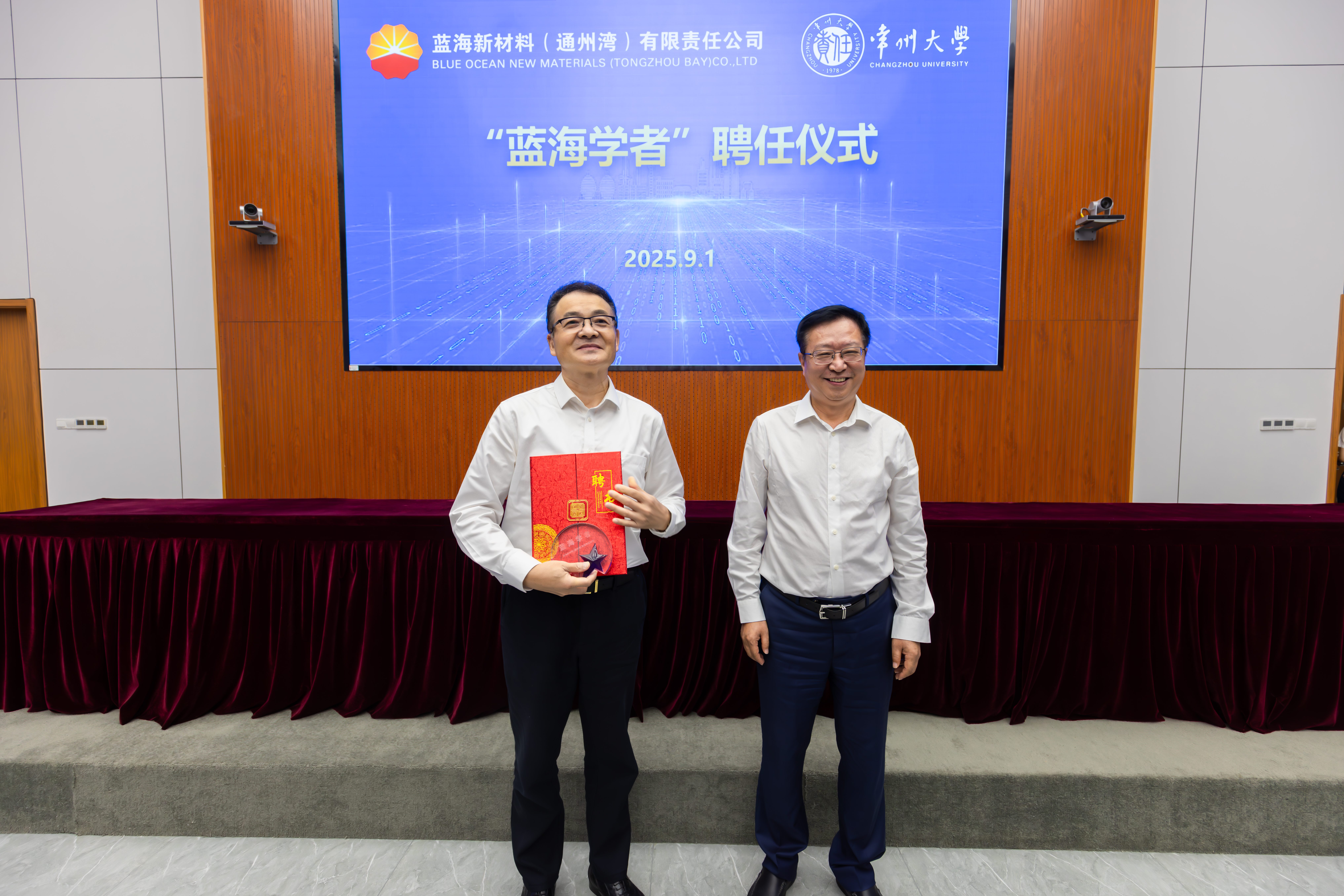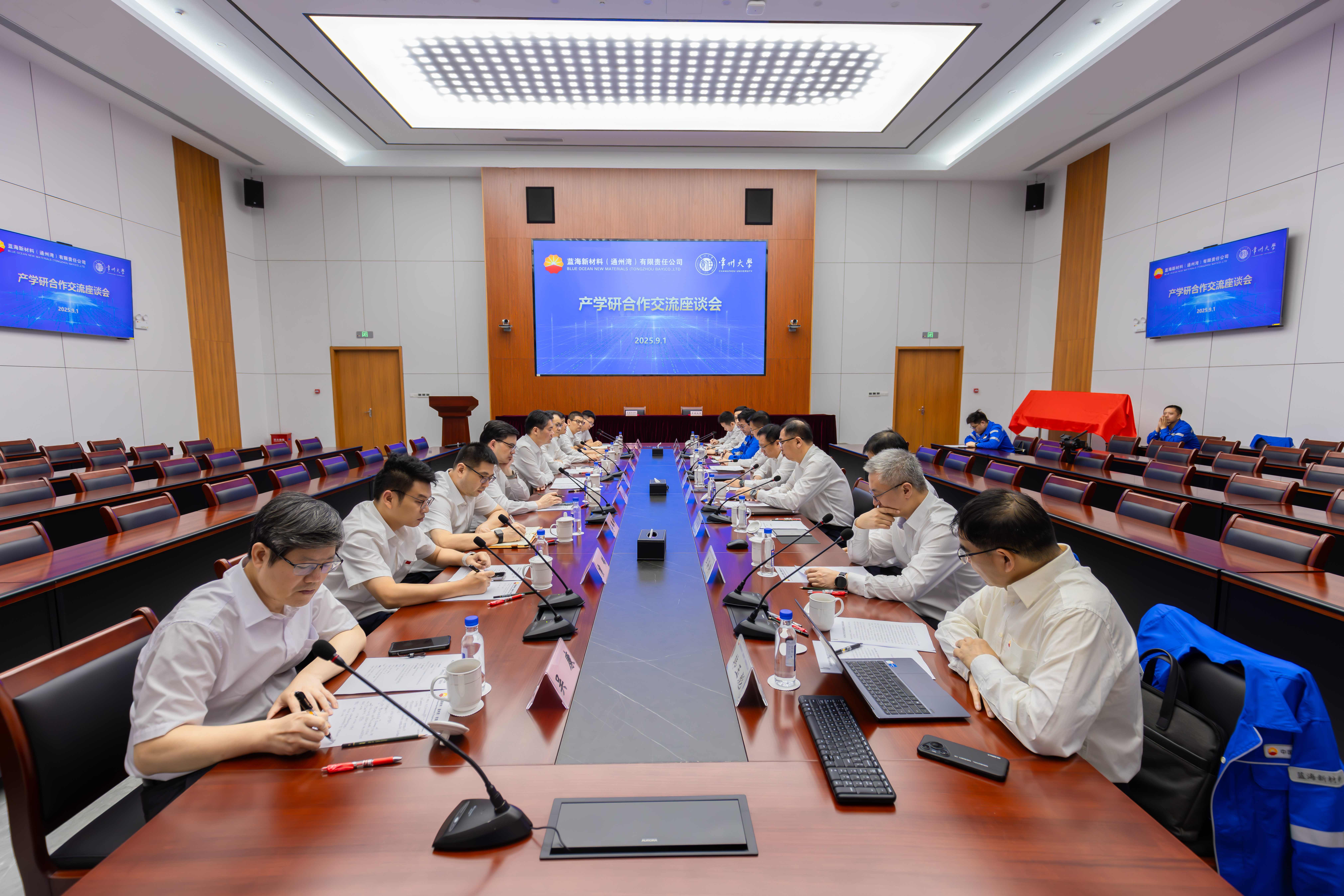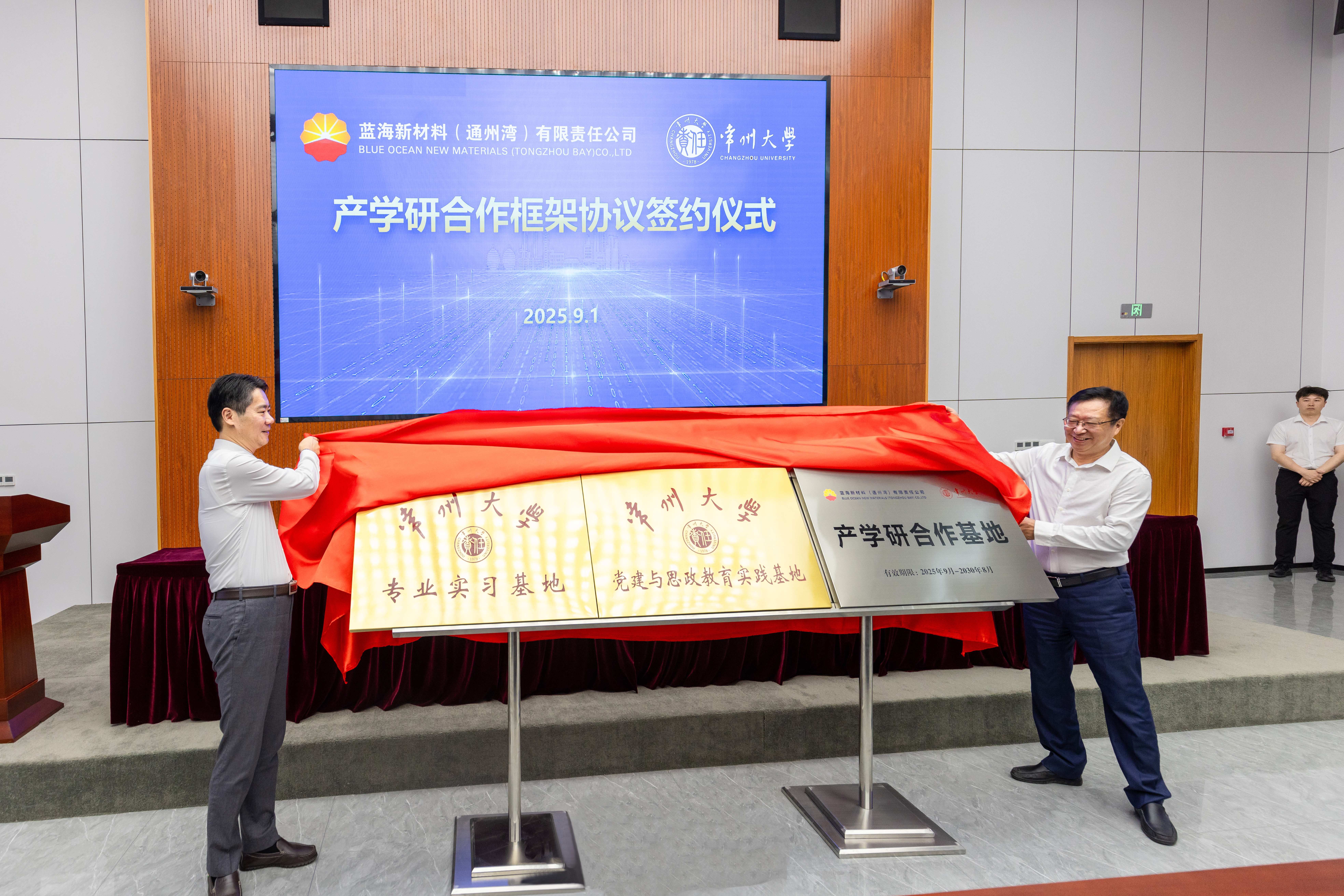 9月1日,常州大学与蓝海新材料(通州湾)有限责任公司(以下简称“蓝海新材料”)合作签约仪式举行。蓝海新材料党委书记、执行董事李贵合,总经理田春光,党委副书记、纪委书记、工会主席陶建文,党委委员、副总经理劳国瑞,以及设计管理部、生产技术部、综合管理部、(党委)办公室、党委组织部(人力资源部)相关负责人出席,常州大学党委副书记、校长陈海群,原党委书记陈群,副校长晏成林及党委组织部、学生工作部、能源化工行业创新处等相关部门负责人参加会议。田春光主持仪式。