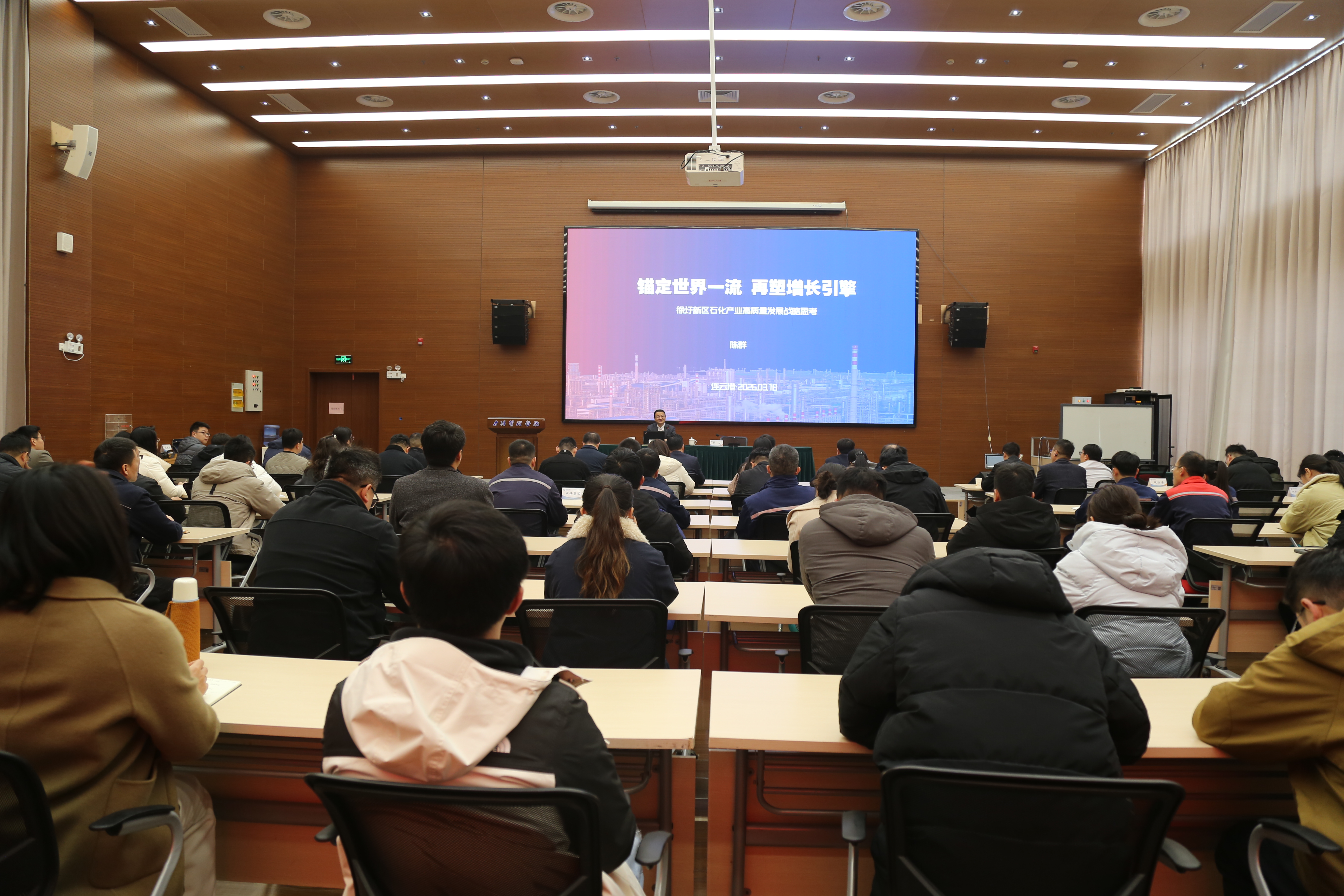 石化产业链政企座谈会 3月18日,徐圩新区举办石化产业高质量发展专题讲座,陈群以“徐圩新区石化产业高质量发展战略思考”为题作专题授课。新区机关、国有企业干部及产业单位经营管理人员80余人参加学习。讲座立足新区产业实际,聚焦行业竞争格局、政策机遇导向、产业链补强升级三大核心,结合国家及省、市规划部署,精准研判发展机遇、系统破解发展难题。同时,围绕校地协同、成果转化、人才培育等方向,为新区产业发展痛点、难点提出兼具指导性与实践性的意见建议。